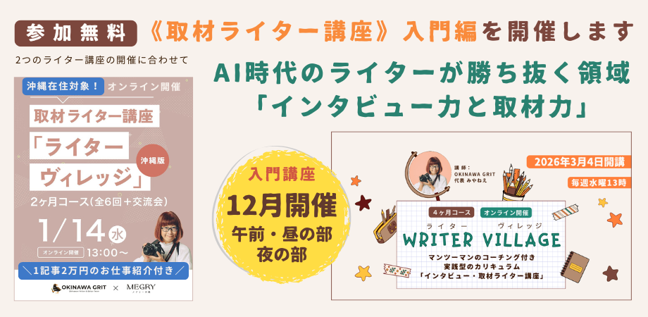 【沖縄在住限定】お仕事紹介付!取材ライター講座「ライターヴィレッジ」沖縄版(2ヶ月間/全6回+交流会/オンライン開催)